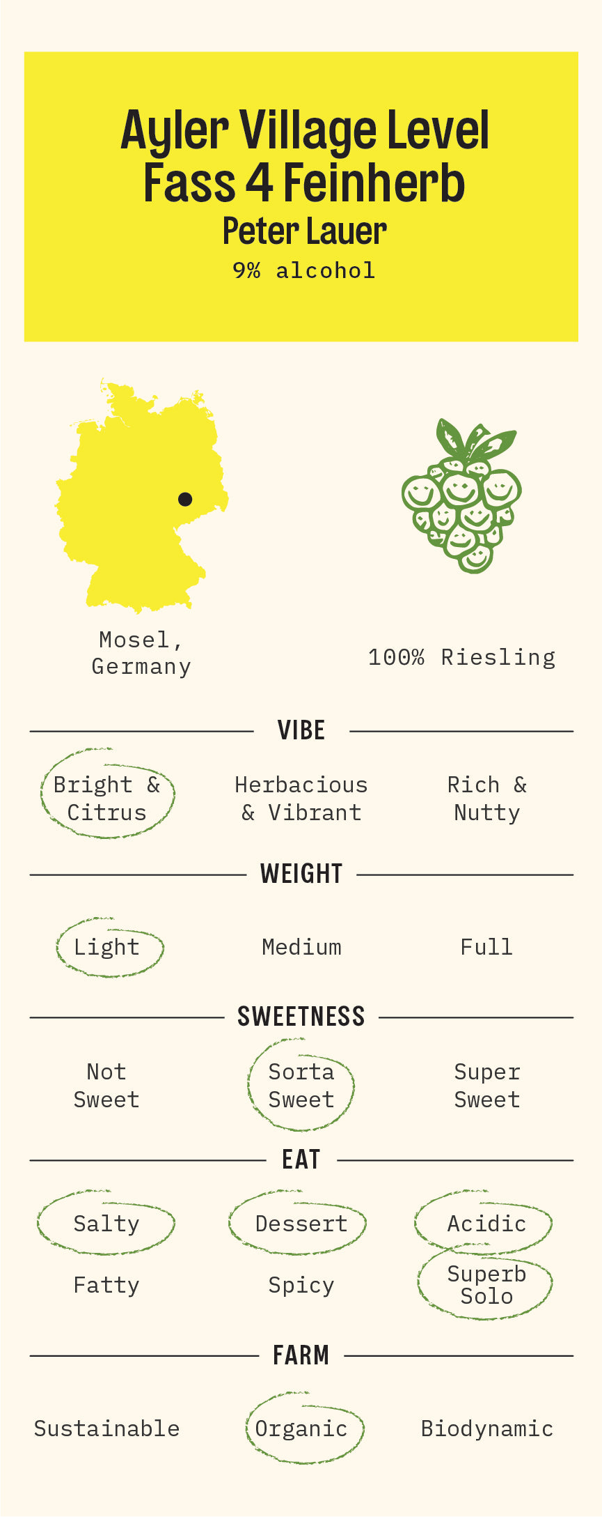 "The 2022 Ayler Riesling N°4 is a fully off-dry wine made from fruit harvested from the Scheidterberg and Sonnenberg side hills. It reveals a nicely aromatic and direct nose of yellow apple, quince, spearmint, pastille Vichy, and thyme. The wine is finely fruity and easy-going on the light-weighted and fresh palate. This is a good off-dry drinking Riesling.