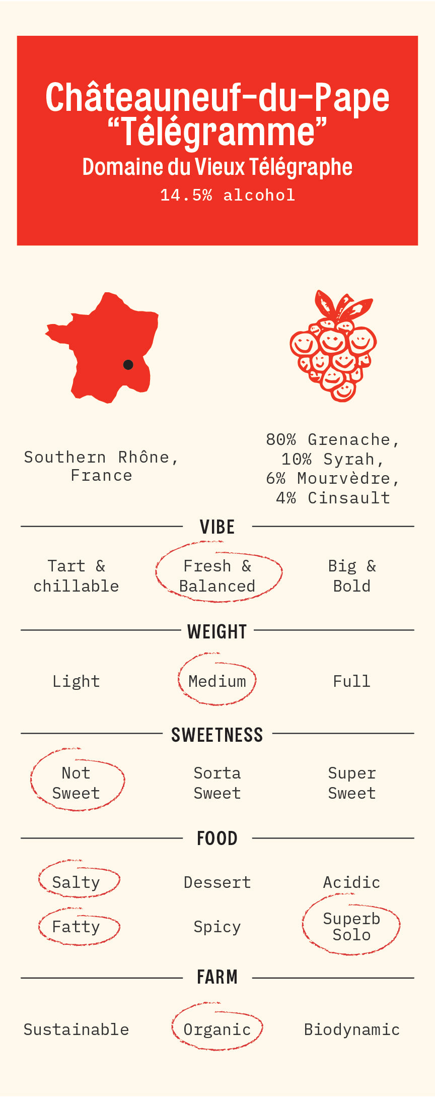 If Télégramme is more about fruit than stones, it is still undeniably Châteauneuf, expressing the nobility of carefully farmed Grenache from the Rhône’s finest terroirs. This unfiltered bottling from the 2021 vintage is one of the best editions to date, with sensual red fruit that is both mouth-filling and weightless, as luxurious as it is accessible. Perfect for enjoying now and over the next few years, it is an ideal match for whatever other fresh, seasonal flavors are on your plate."