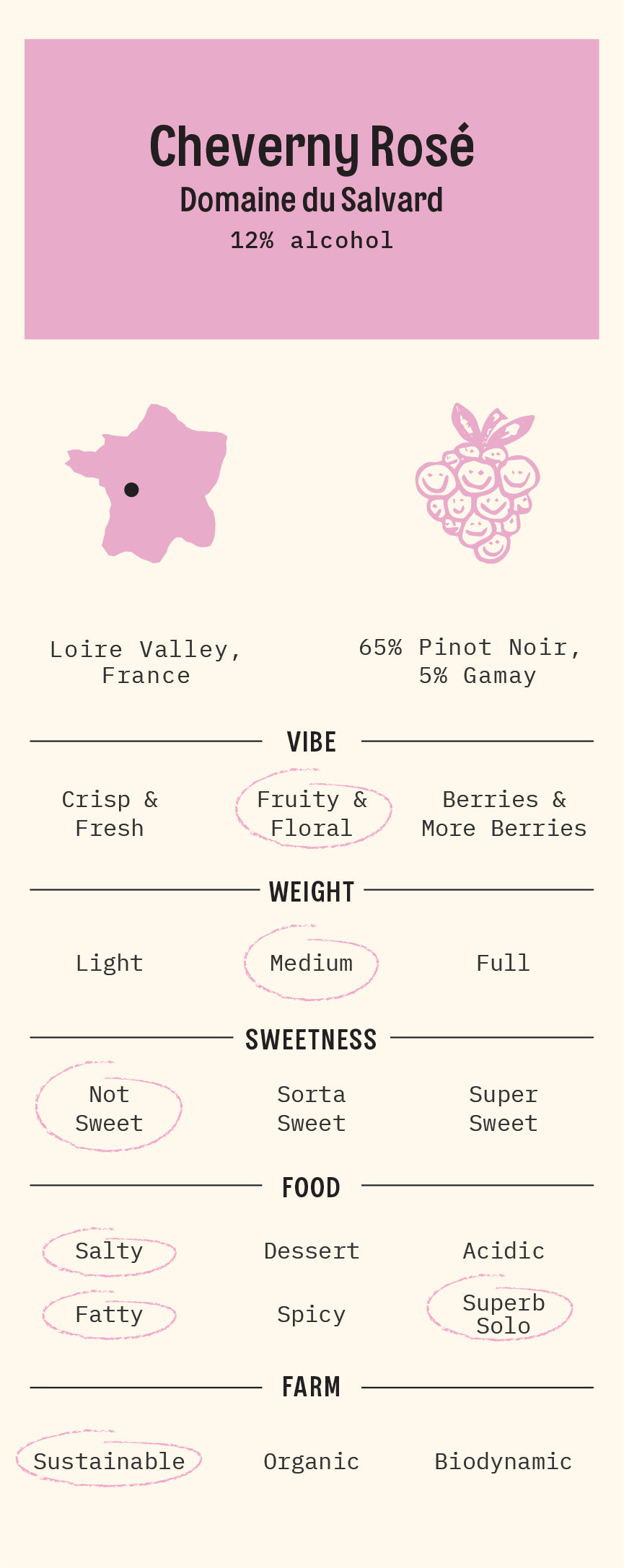 "Domaine du Salvard’s rosé of Pinot Noir and Gamay is what I think of as “perfect lunchtime wine”—youthful red berries and a refreshing zip of citrus lend themselves well to just about any fare from hearty salads to comforting soups, grain bowls to juicy burgers. Lighthearted and decidedly energetic, it almost goes down too easily."