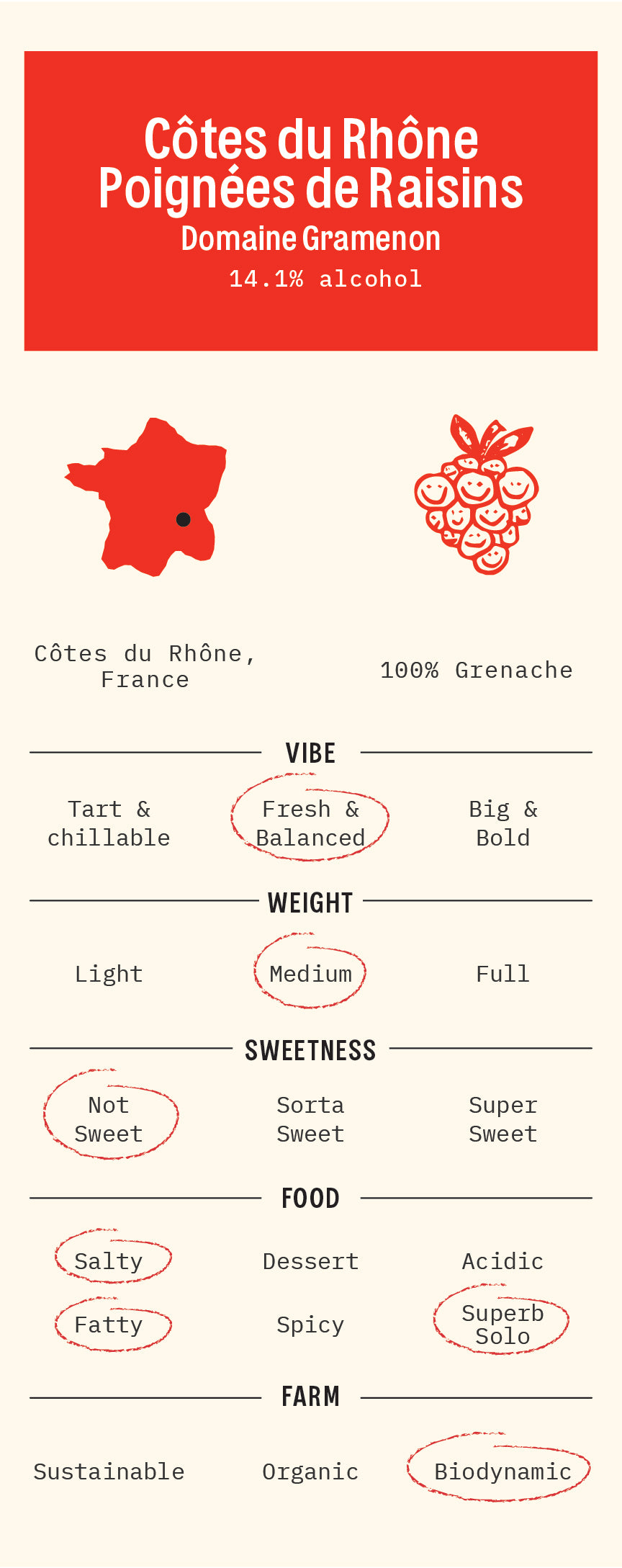 From the importer: "As an early adopter of biodynamic farming, Michèle Aubery-Laurent transformed her remote domaine in Montbrison-sur-Lez into a benchmark producer of Grenache-based reds. With this cuvée, perhaps the most iconic in her lineup, she reimagined what Grenache could be: easy-drinking, weightless, and precise. Today, Poignée de Raisins—which translates enticingly to a “fistful of grapes”—has gone on to influence countless contemporary growers across France who embrace a similar style. But for a taste of the original glou-glou southern Rhône rouge, pull the cork on this bottling."