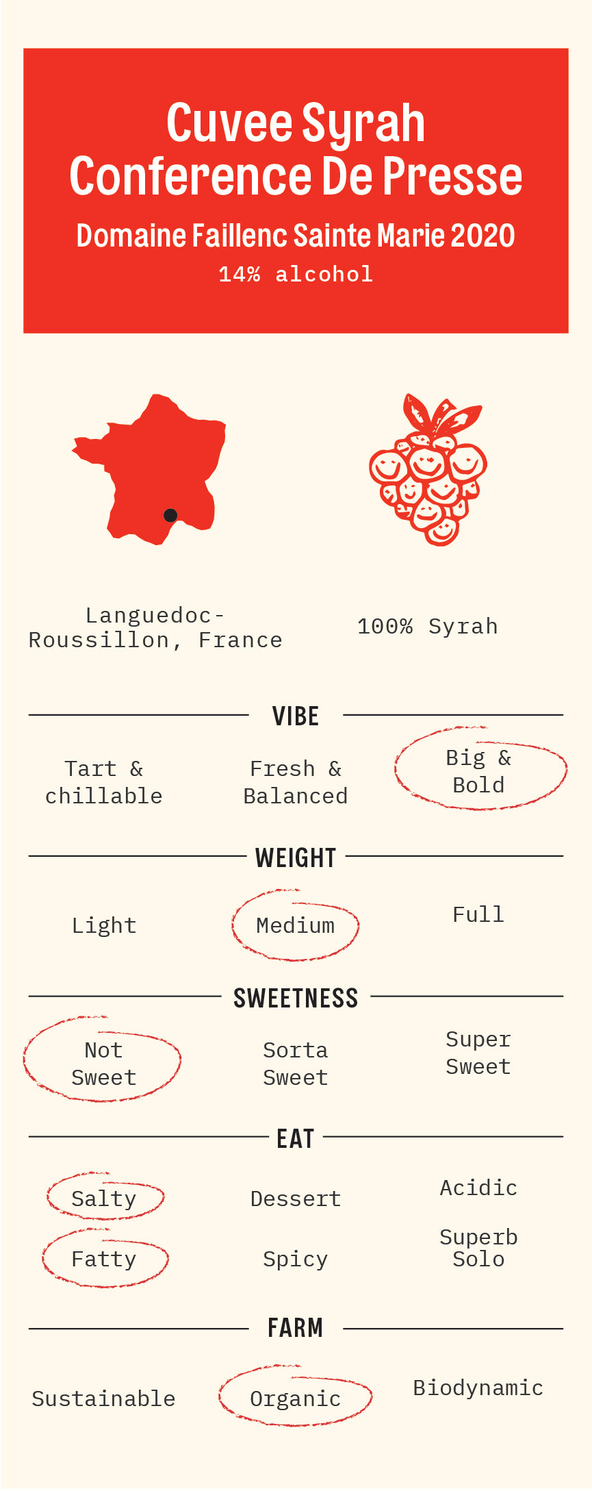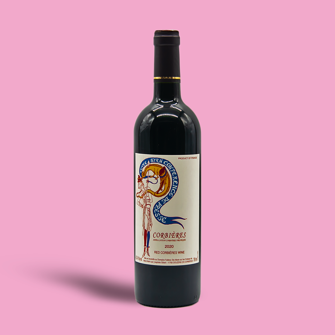 From the importer: "A special cuvee of Corbières Rouge, the “Syrah Conférence de Presse”, is a unique and profound wine. Its name is derived from a play on words that refers to its origin as a “press wine” exclusively from Syrah. Contrary to the traditional Corbières mentioned above, this wine is aged in small oak barrels (not new). The resulting wine is powerful and velvety at the same time. It is rare to find a press wine with this sort of finesse and complexity."