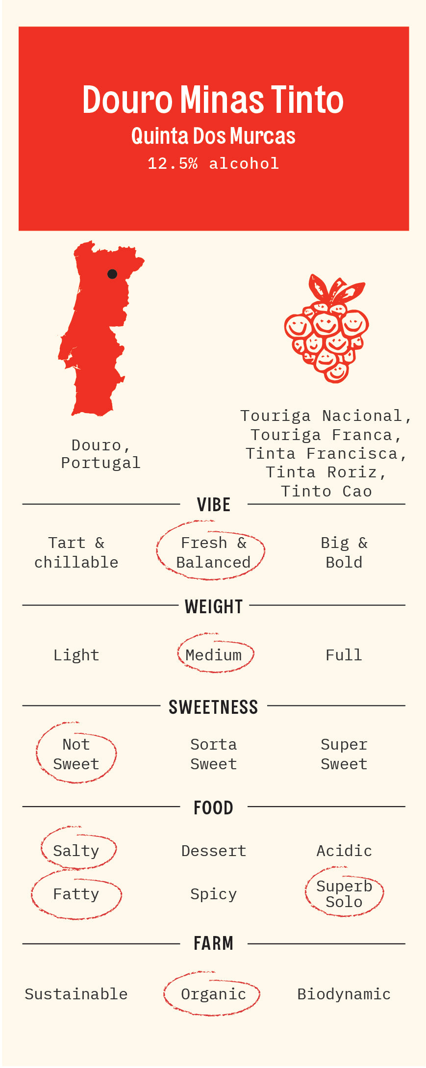Red Blend of Indigenous Portuguese Grapes (Touriga Nacional, Touriga Franca, Tinta Francisca, Tinta Roriz, Tinto Cao) from Douro, Portugal. Organic.