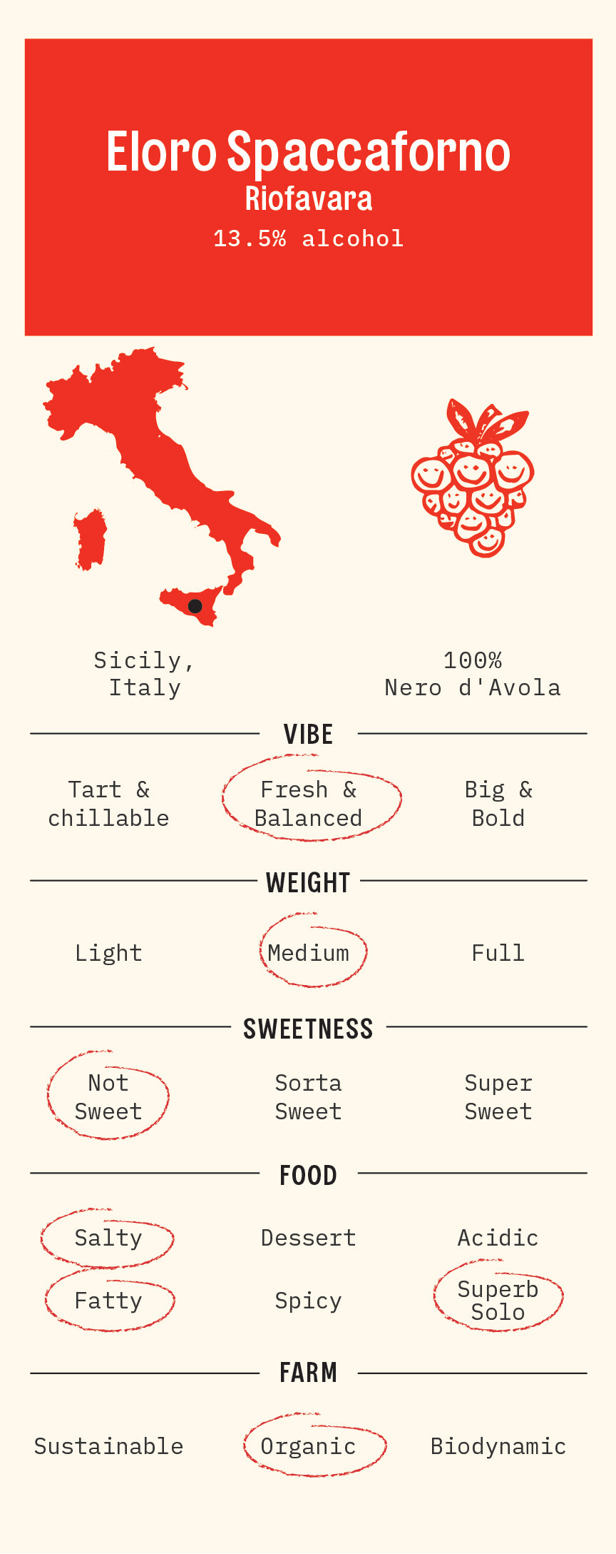 As enthralled as we are by the wines of Mount Etna, Riofavara is proof that there is more to Sicily than the slopes of that epic volcano. Nero d’Avola is the reigning grape near the island’s southernmost point and expresses a tart, brambly side in this Spaccaforno. Along with our other selections from this island, it will have you raising Sicily higher on your list of places to travel next!