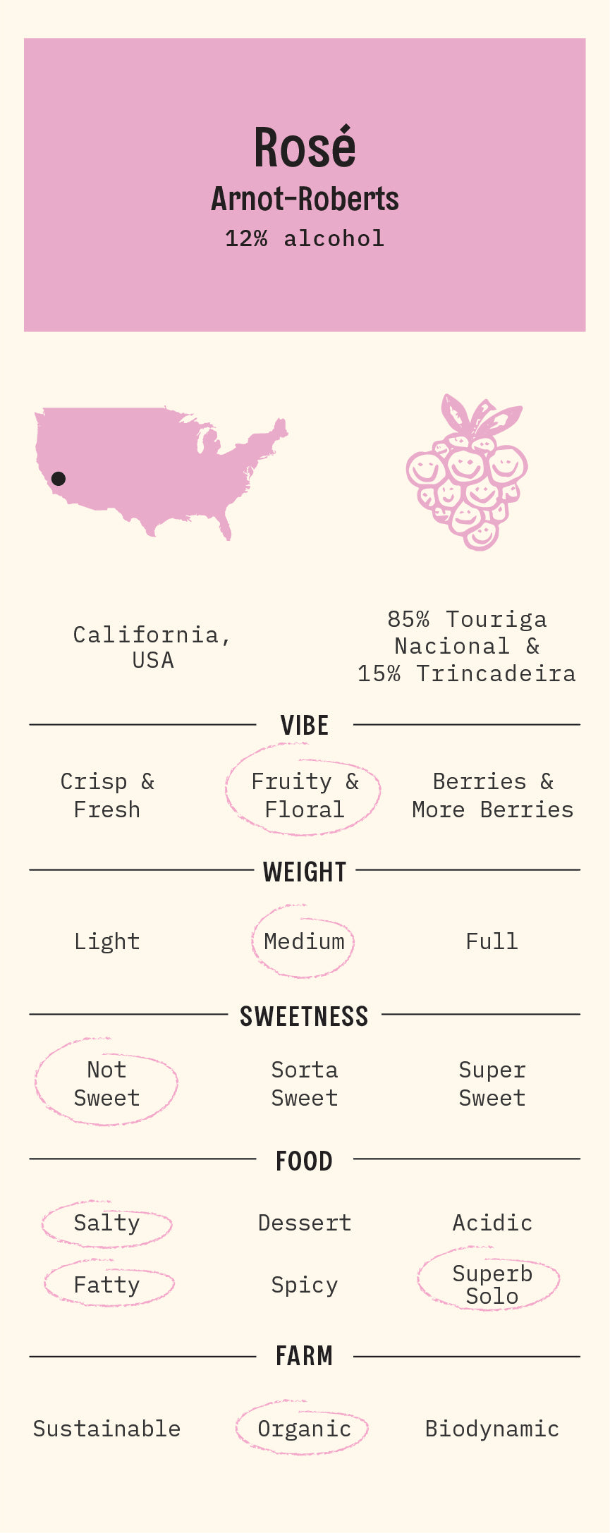 From the winemakers, "We began making Rosé from Touriga Nacional in 2010. We were compelled by the grape’s deep color, brilliant acidity and aromatic complexity even at low sugar content. Touriga is a late-ripening Portuguese variety that needs some heat to mature, and we have sought out vineyards suited to this hearty variety. The original fruit source came from the rocky volcanic soils of the Luchsinger vineyard, located at 1400′ in the Clear Lake AVA. In 2015, we added Touriga from St. Amant, planted in sandy granitic loam at the base of the Sierra Nevadas in Amador County. In 2021 we discovered Touriga at St. Jorge vineyard in Lodi’s Mokelumne River AVA, planted in granitic alluvial soils amidst steady delta breezes. We also utilized the intriguing Tinta Cão from this site, and in 2022 we added Trincadeira as well. Additionally, we were able to source a small block of Grenache from the incredible Fenaughty vineyard situated at 2,800’ elevation in the Sierra Foothills above Placerville.