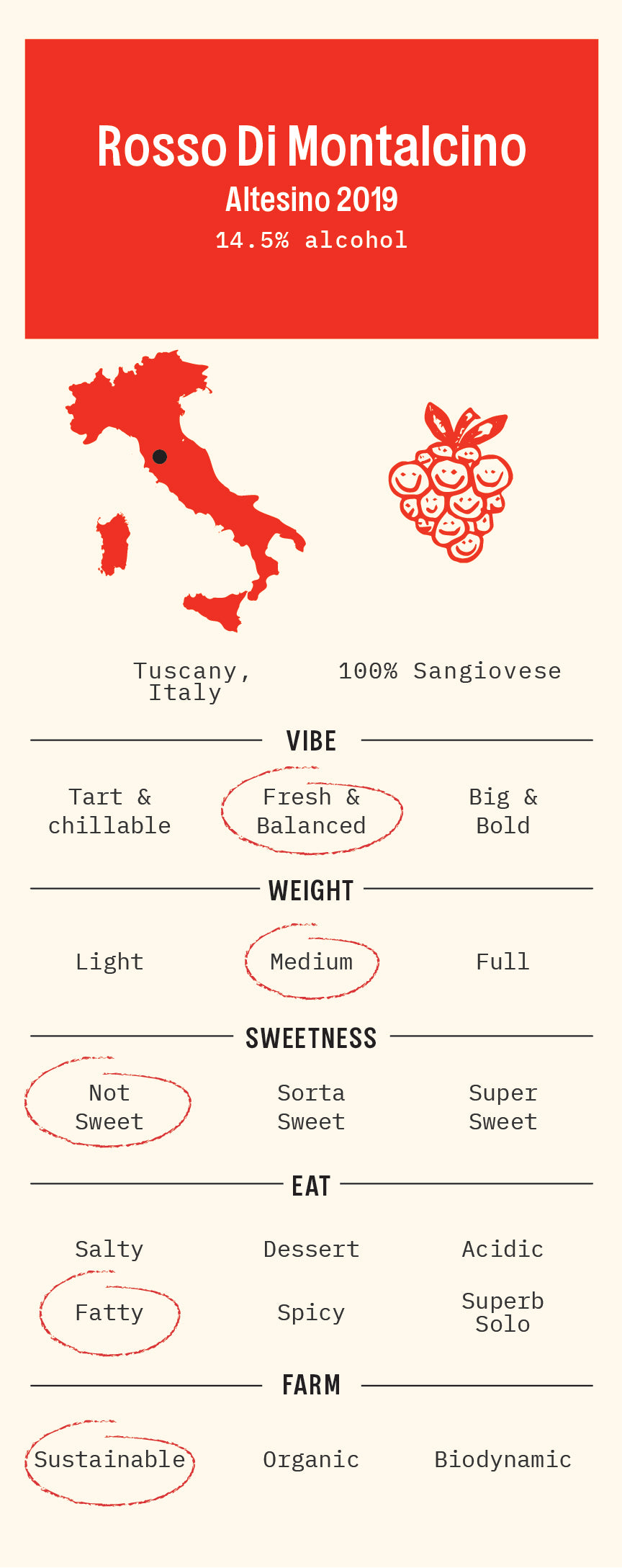 From the importer: "Brilliant ruby-red color, this classic Rosso offers sumptuous aromas of ripened blackberries and dark cherries. On the palate, the wine is generously well-rounded and rich with fruit-forward notes complimented by hints of leather and mesquite."