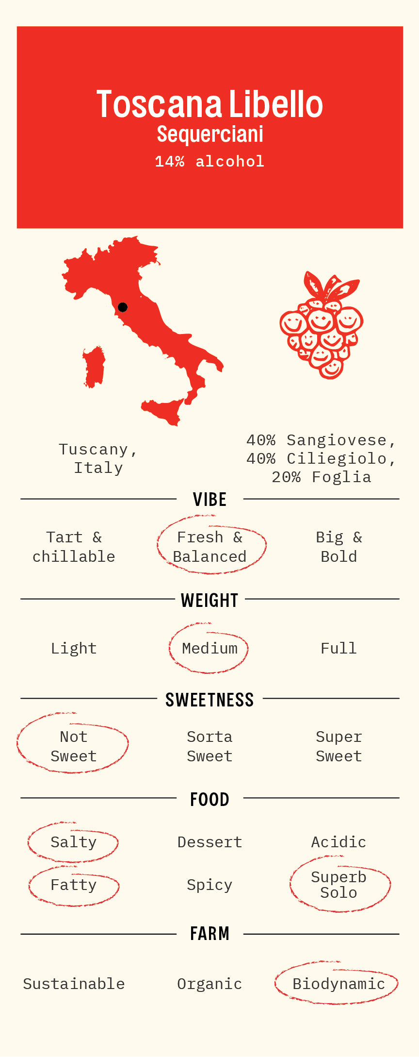 40% Sangiovese, 40% Ciliegiolo, & 20% Foglia Tonda from Tuscany, Italy.