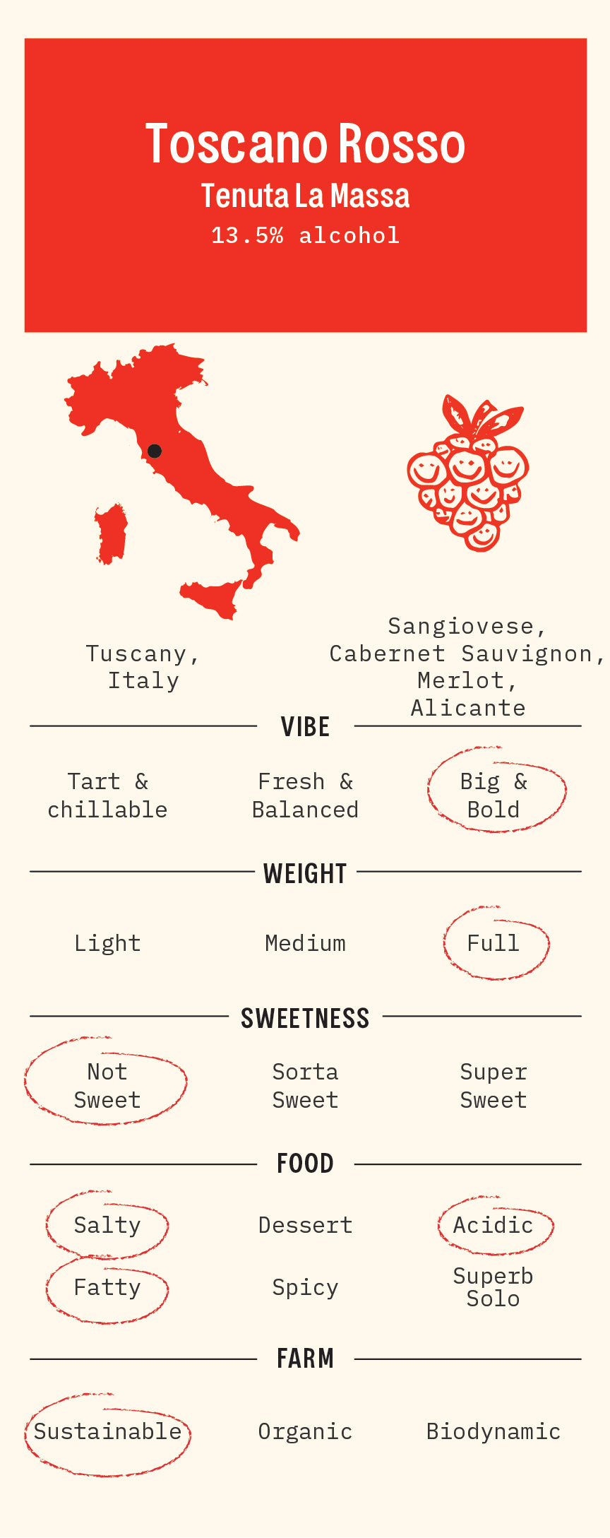 Sangiovese, Cabernet Sauvignon, Merlot, & Alicante from Tuscany, Italy.