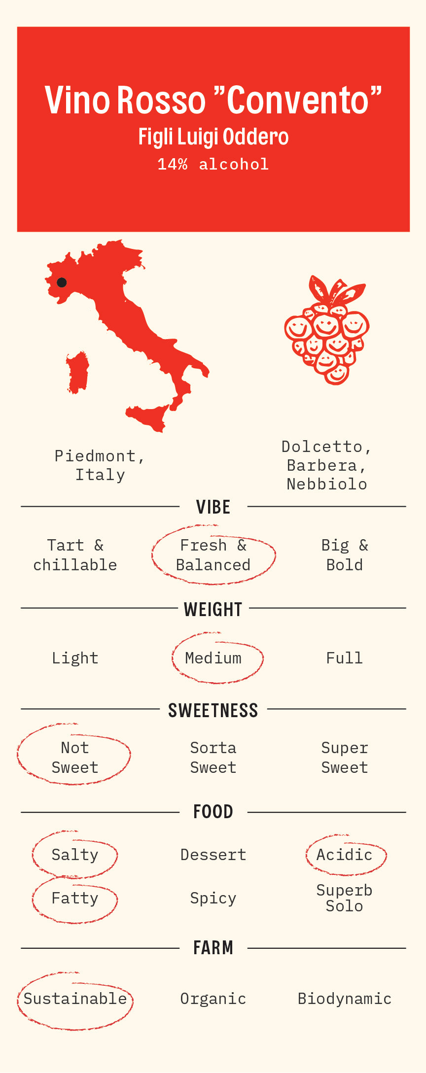 A red blend of Dolcetto, Barbera, & Nebbiolo from Piedmont, Italy.